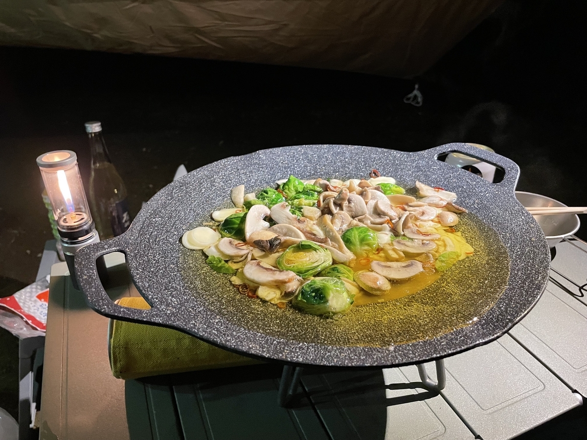 キャンプ。ラウンドグリドルパンで芽キャベツのアヒージョ。2月だったので伊豆の南の方のキャンプ場でした。