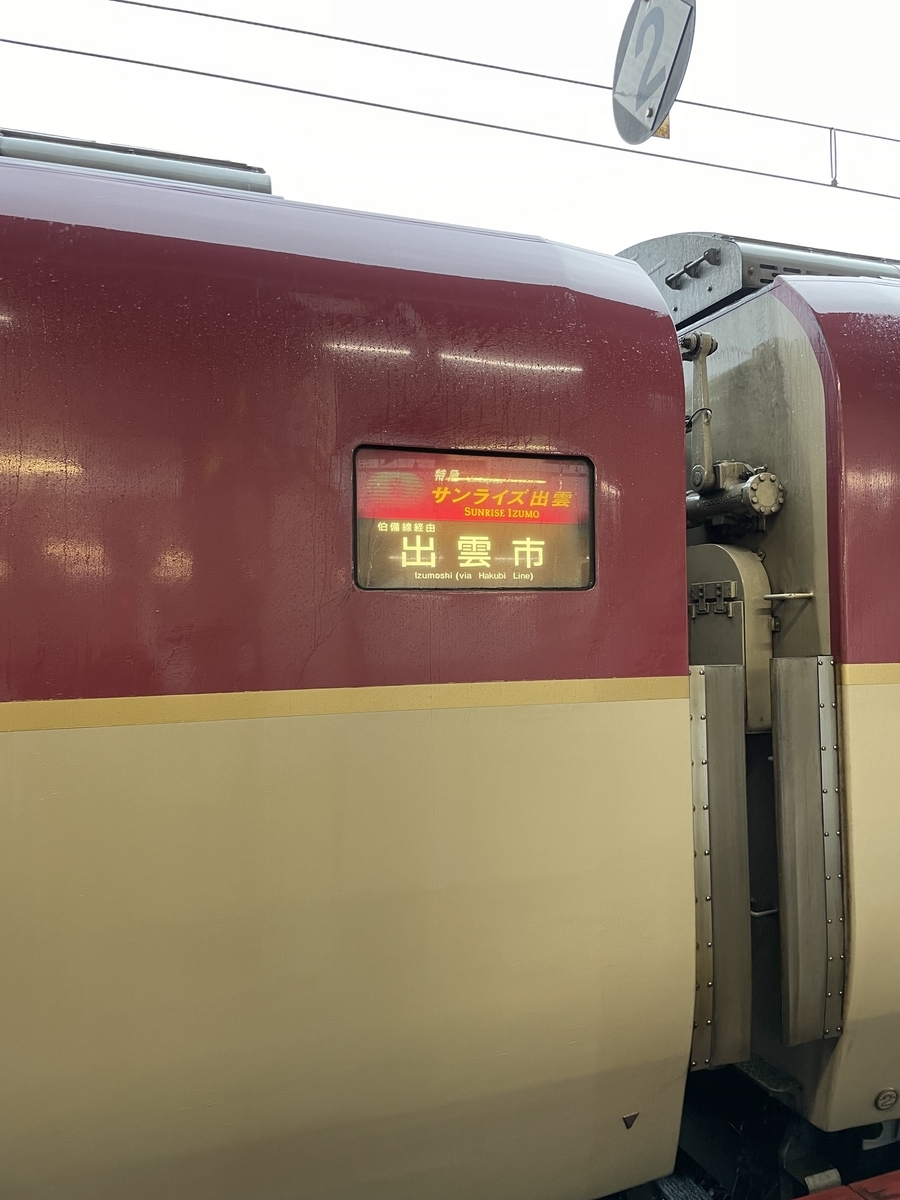 サンライズ出雲で出雲市駅まで行って、出雲大社行って帰るっていう予定だったんですけれど、大雨で松江で打ち切りを喰らって、スーパーまつかぜで鳥取、スーパーはくとで姫路まで行き、そこから新幹線で帰りました。帰りはやくもの予定だったのですが、次乗る時には車両新しくなってそう。